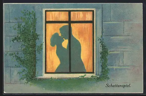 AK Schatten eines küssendes Liebespaares, das durch ein Fenster zu sehen ist