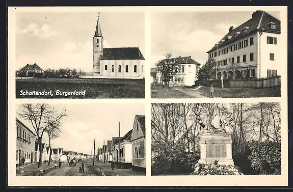 AK Schattendorf, Kirche, Ehrenmal und Strassenpartie
