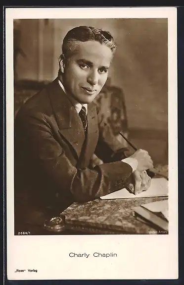 AK Schauspieler Charlie Chaplin mit pomadisiertem Haar im Anzug, ein Füllfederhalter in der Hand