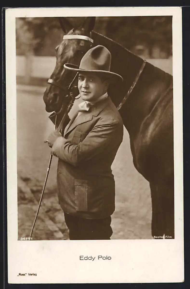 AK Schauspieler Eddy Polo posiert mit Pferd und Hut