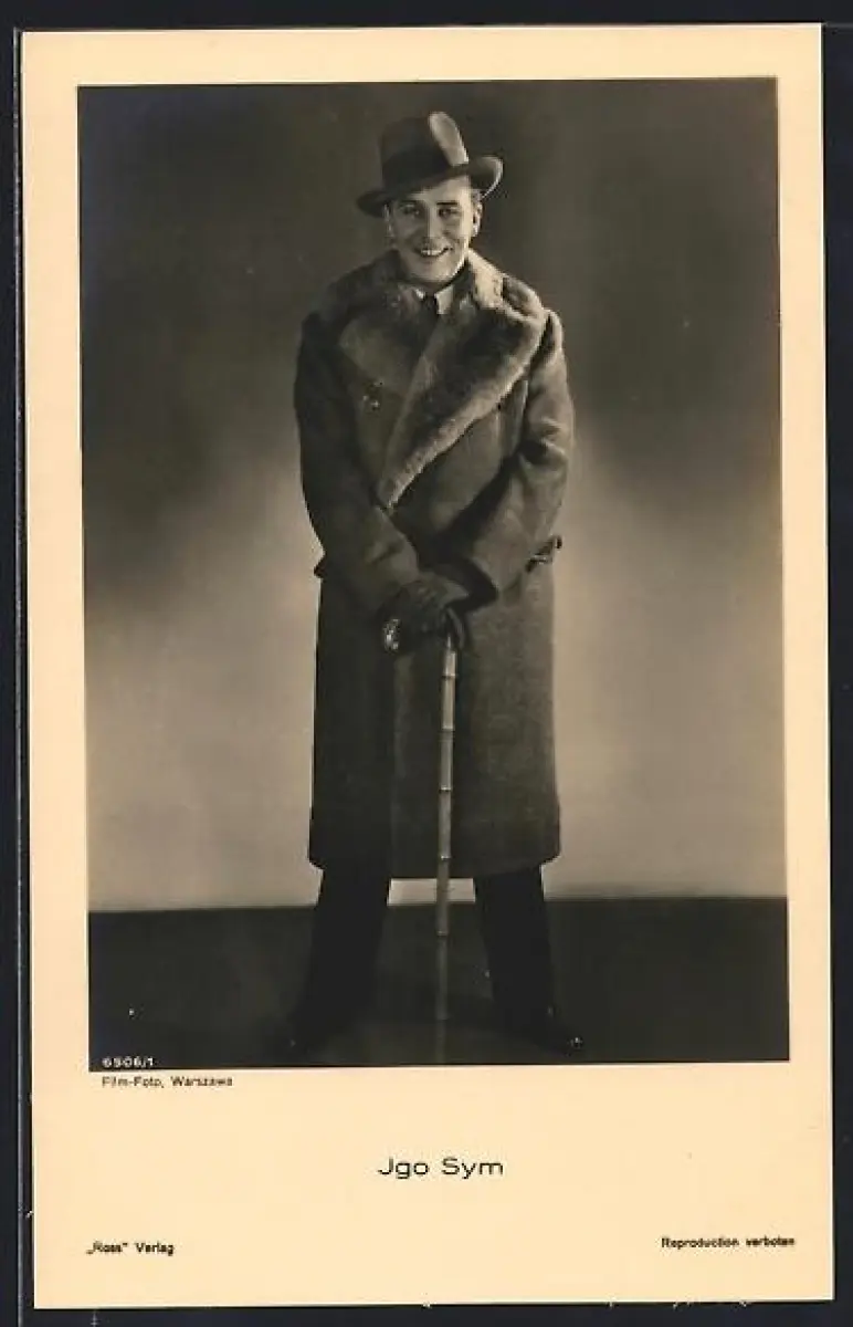 AK Schauspieler Igo Sym im Mantel mit Gehstock