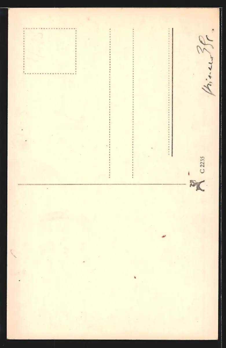 Personenbezogene Daten auf der Rückseite der Karte wurden durch blauen Textmarker unkenntlich gemacht. Die blauen Stellen sind auf die Vorderseite durchgeweicht und wirken sich negativ auf das Postkartenfoto aus