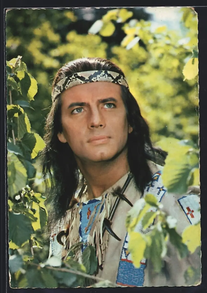 AK Schauspieler Pierre Brice im Versteck in dem Film Winnetou, Teil 2
