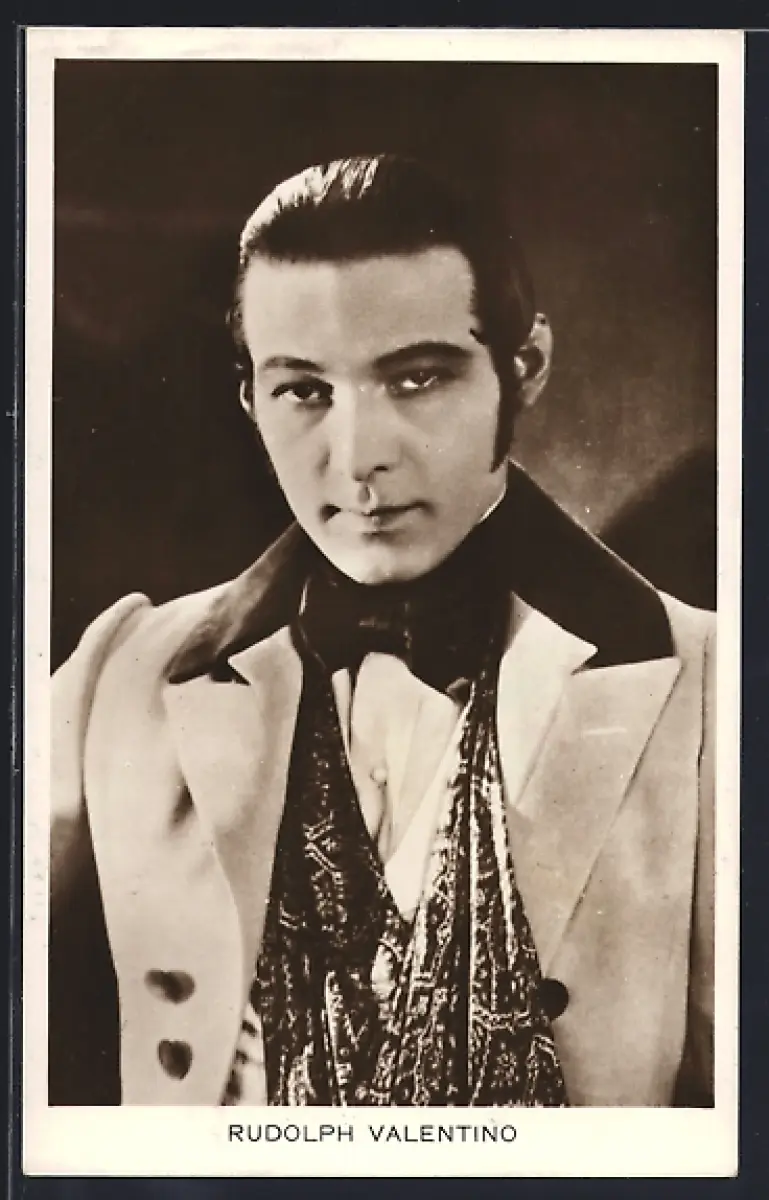 AK Schauspieler Rudolph Valentino mit feinem Mantel und verziertem Halstuch