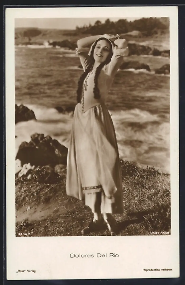 AK Schauspielerin Dolores Del Rio in schlichten Kleidern am Meer