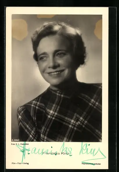 AK Schauspielerin Franziska Kinz im kariertem Kleid, mit original Autograph