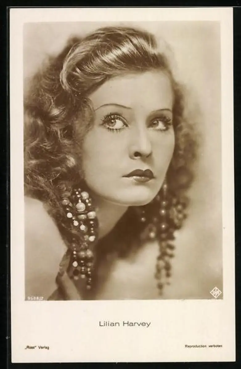 AK Schauspielerin Lilian Harvey, Portrait mit riesigen Perlen-Ohrringen
