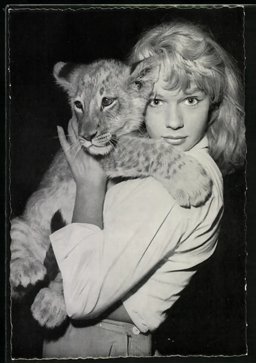 AK Schauspielerin Marion Michael mit einem Löwenbaby im Arm