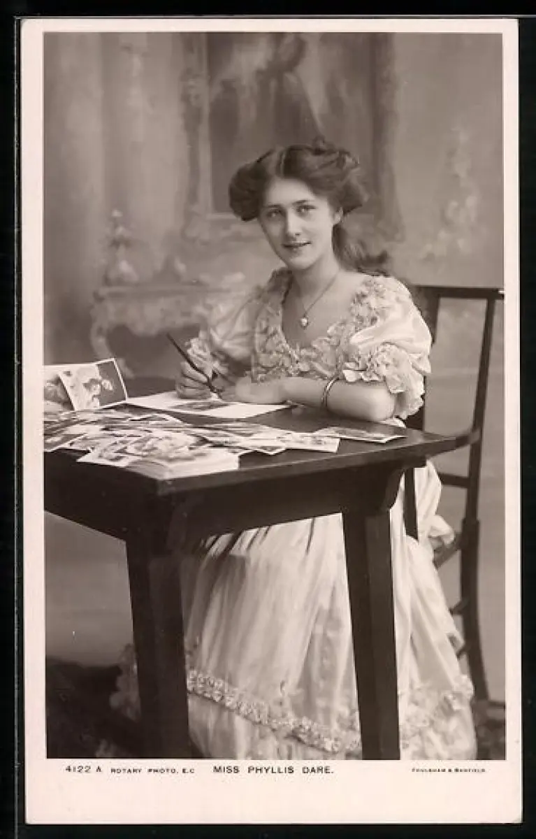 AK Schauspielerin Phyllis Dare sitzt an einem Tisch und unterzeichnet Ansichtskarten mit ihrem Bildnis