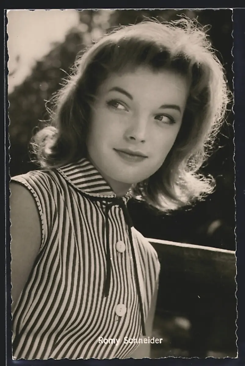 AK Schauspielerin Romy Schneider in gestreifter Bluse
