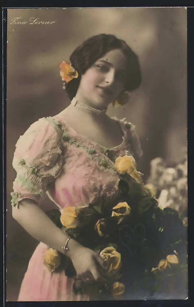 AK Schauspielerin Tina Lerner in sommerlichem Kleid mit Blumenstrauss