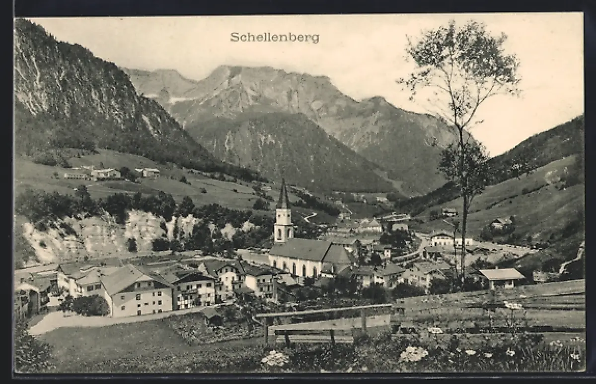 AK Schellenberg / Obb., Ortsansicht mit Kirche und Bergen