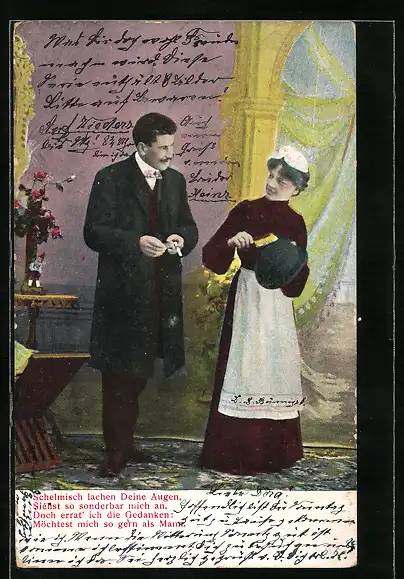 AK Schelmisch lachen Deine Augen, siehst so sonderbar mich an..., Mann mit Dienstmädchen