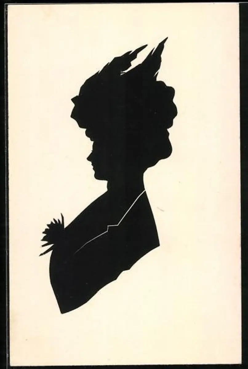 AK Scherenschnitt einer feinen jungen Dame mit reich geschmücktem Hut