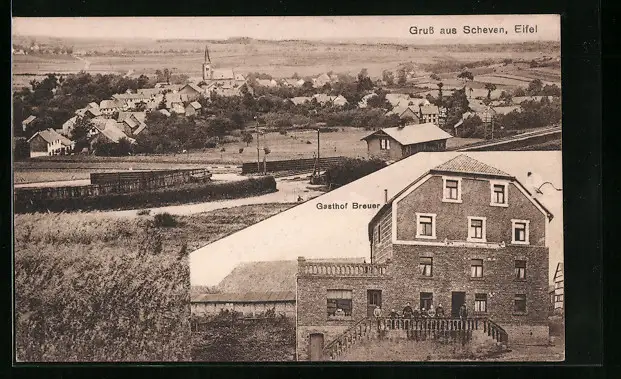 AK Scheven i. Eifel, Ortsansicht mit Gasthof Breuer