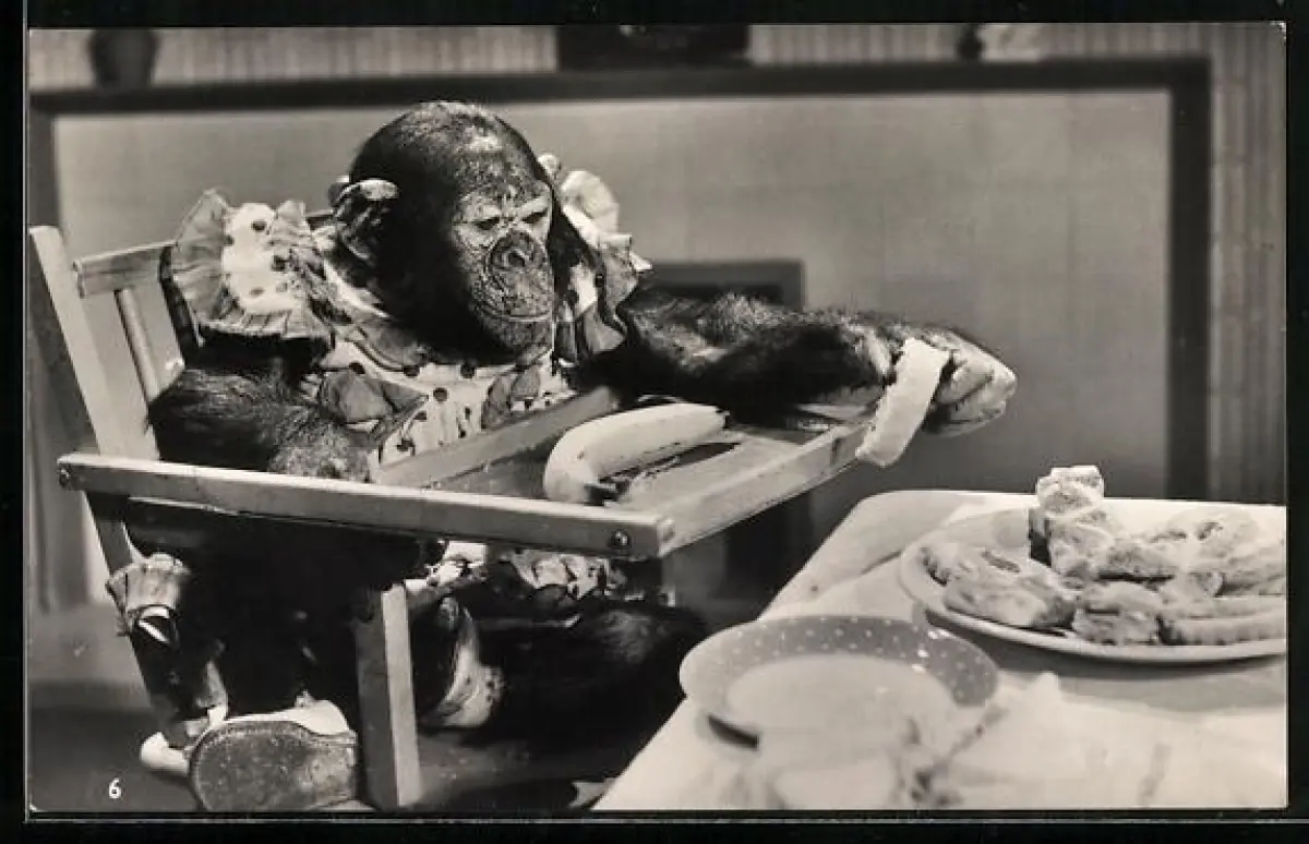 AK Schimpansenkind auf einem Babystühlchen vor gedecktem Tisch
