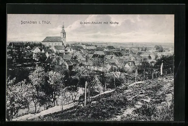 AK Schkölen i. Th., Gesamtansicht mit Kirche