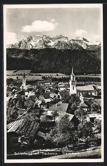 AK Schladming /Steiermark, Ortsansicht mit Kirche und Dachstein