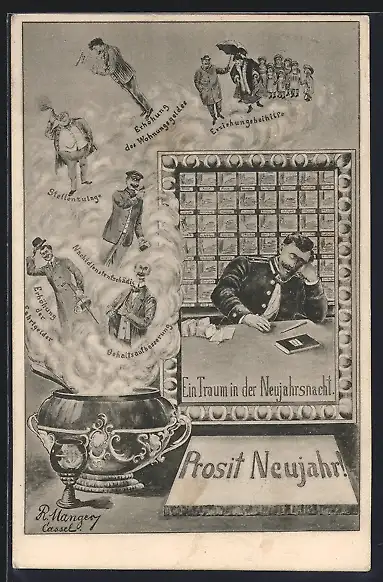 AK Schlafender Briefträger traümt in der Neujahrsnacht, Punschgefäss, Neujahrsgruss