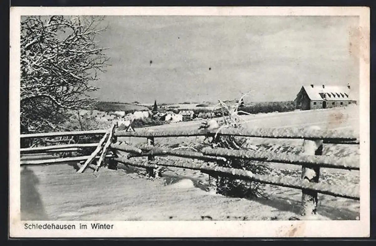 AK Schledehausen / Bissendorf, Winterlandschaft mit verschneitem Zaun und Ortsansicht