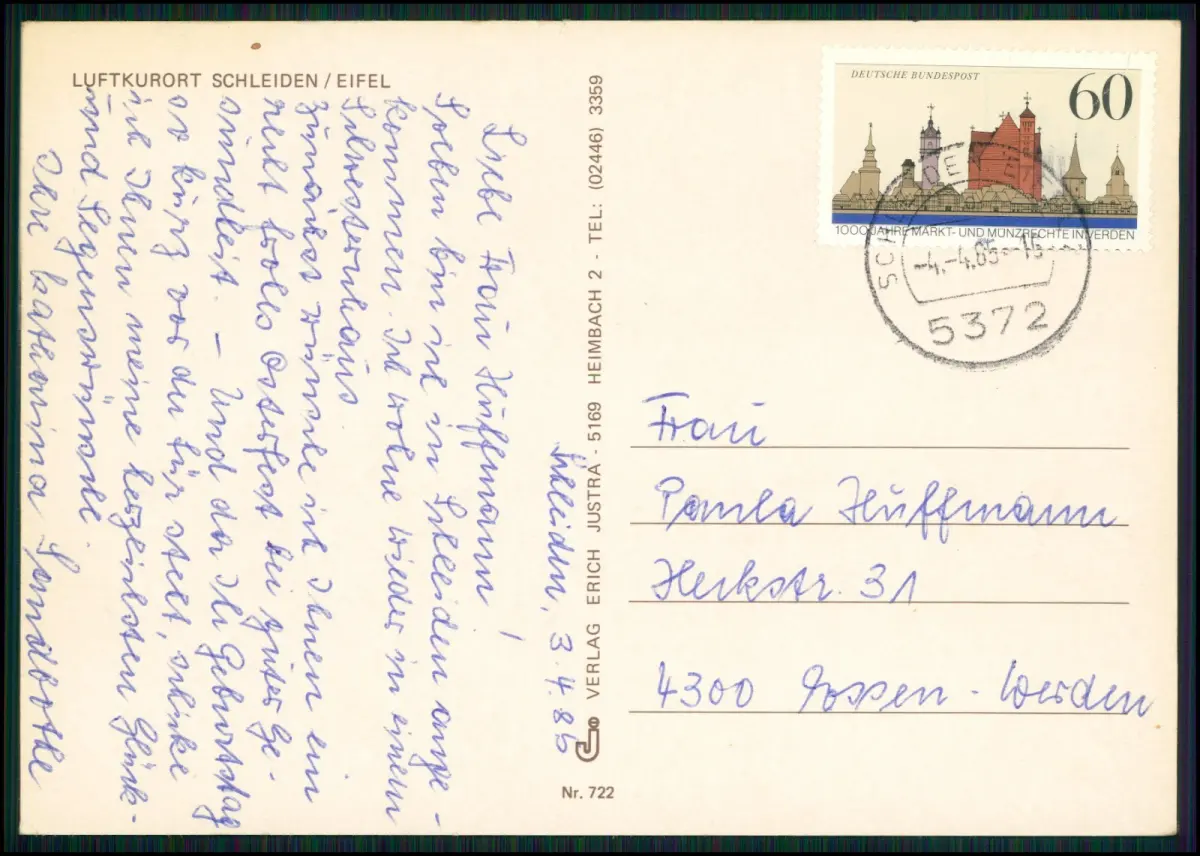 Handschriftlicher Urlaubsgruß mit Poststempel Schleiden 3.8.1988, frankiert mit 60 Pfennig „1000 Jahre Markt- und Münzrechte Verden“ der Deutschen Bundespost. Adressiert an Frau Paula Kniffmann, Essen-Werden.