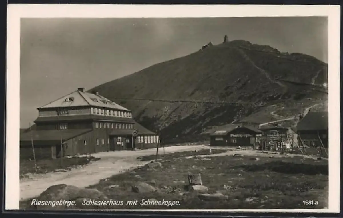 AK Schlesierhaus /Riesengebirge, Mit Schneekoppe, Photographie und Andenken-Verkauf