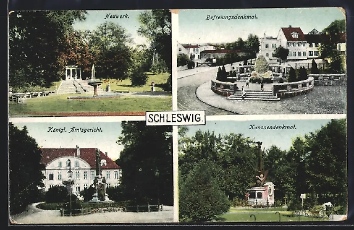 AK Schleswig, Neuwerk, Befreiungsdenkmal, Königl. Amtsgericht, Kanonendenkmal