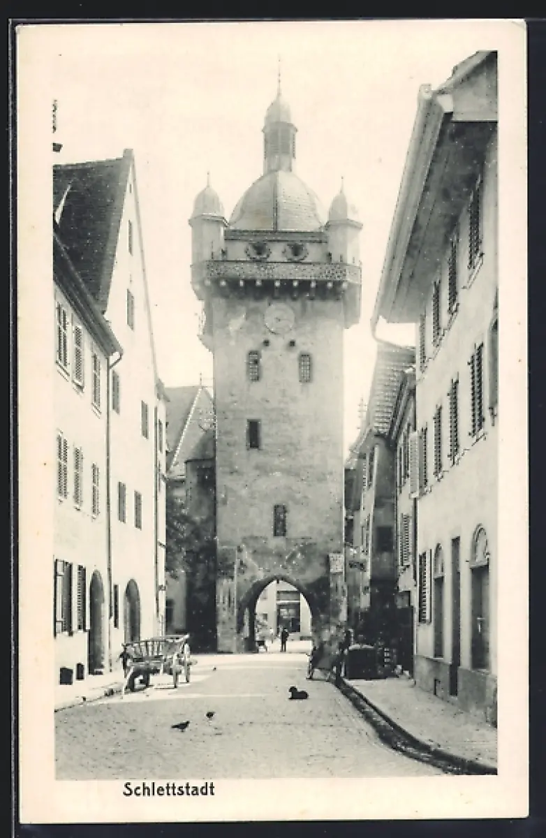 AK Schlettstadt, Vue du portail médiéval avec rue animée et charrette