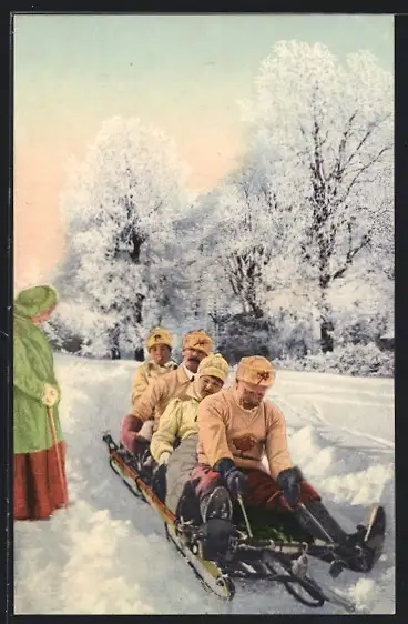 AK Schlittenfahrer zu viert auf einem Schlitten