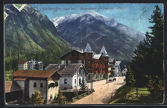 AK Schluderbach, Tirol, Strassenpartie mit Ampezzaner Dolomiten