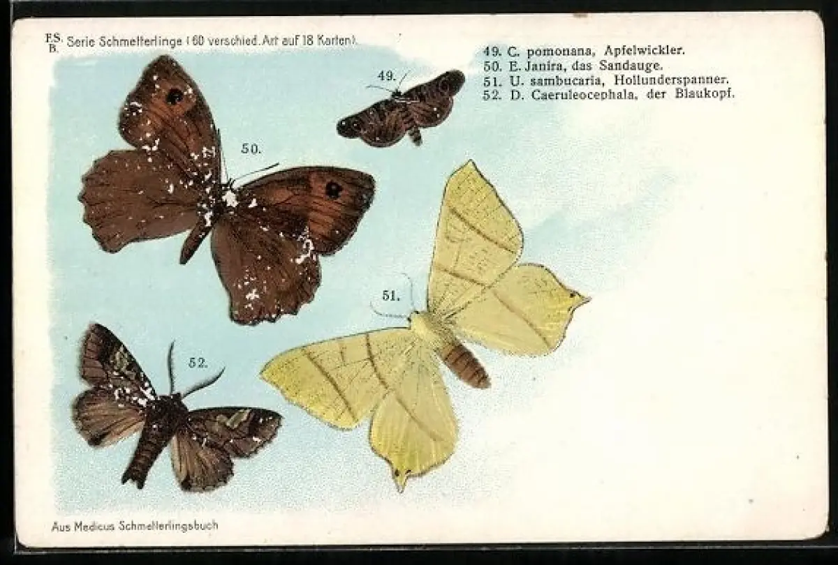 AK Schmetterlinge, Apfelwickler, C. pomonana, Sandauge, E. Janira, Hollunderspanner, U. sambucaria