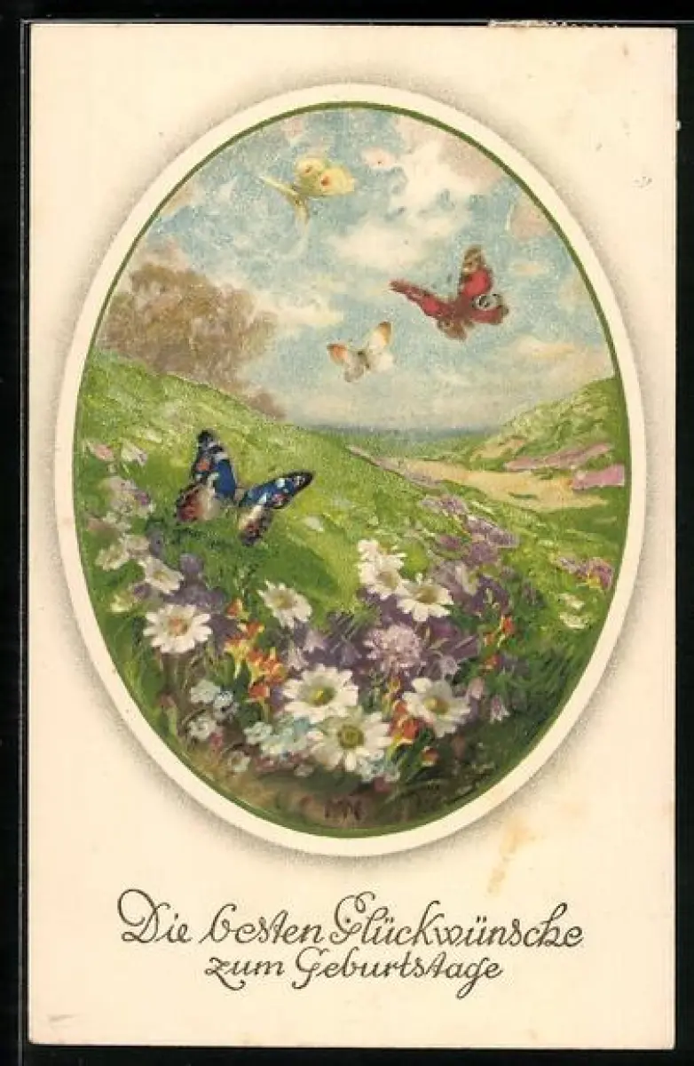 AK Schmetterlinge fliegen über eine Blumenwiese, Glückwunsch zum Namenstag