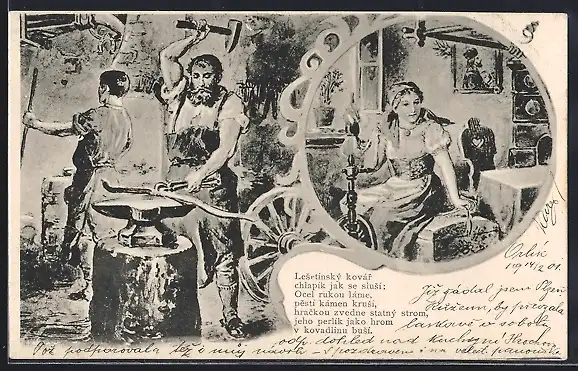 AK Schmied mit Hammer in der Werkstatt, junge Dame mit Spinnrad in der Stube