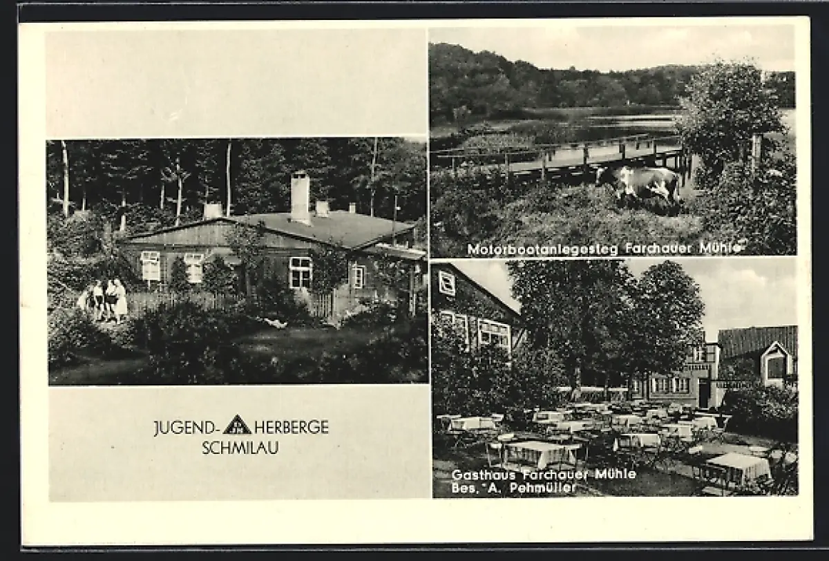 AK Schmilau, Jugendherberge, Gasthaus Farchauer Mühle, Bes. A. Pehmüller, Motorbootanlegesteg Farhdauer Mühle