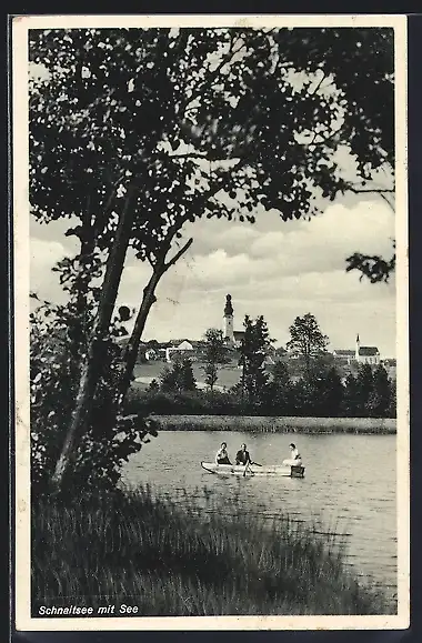AK Schnaitsee, Ortsansicht mit Ruderboot auf See