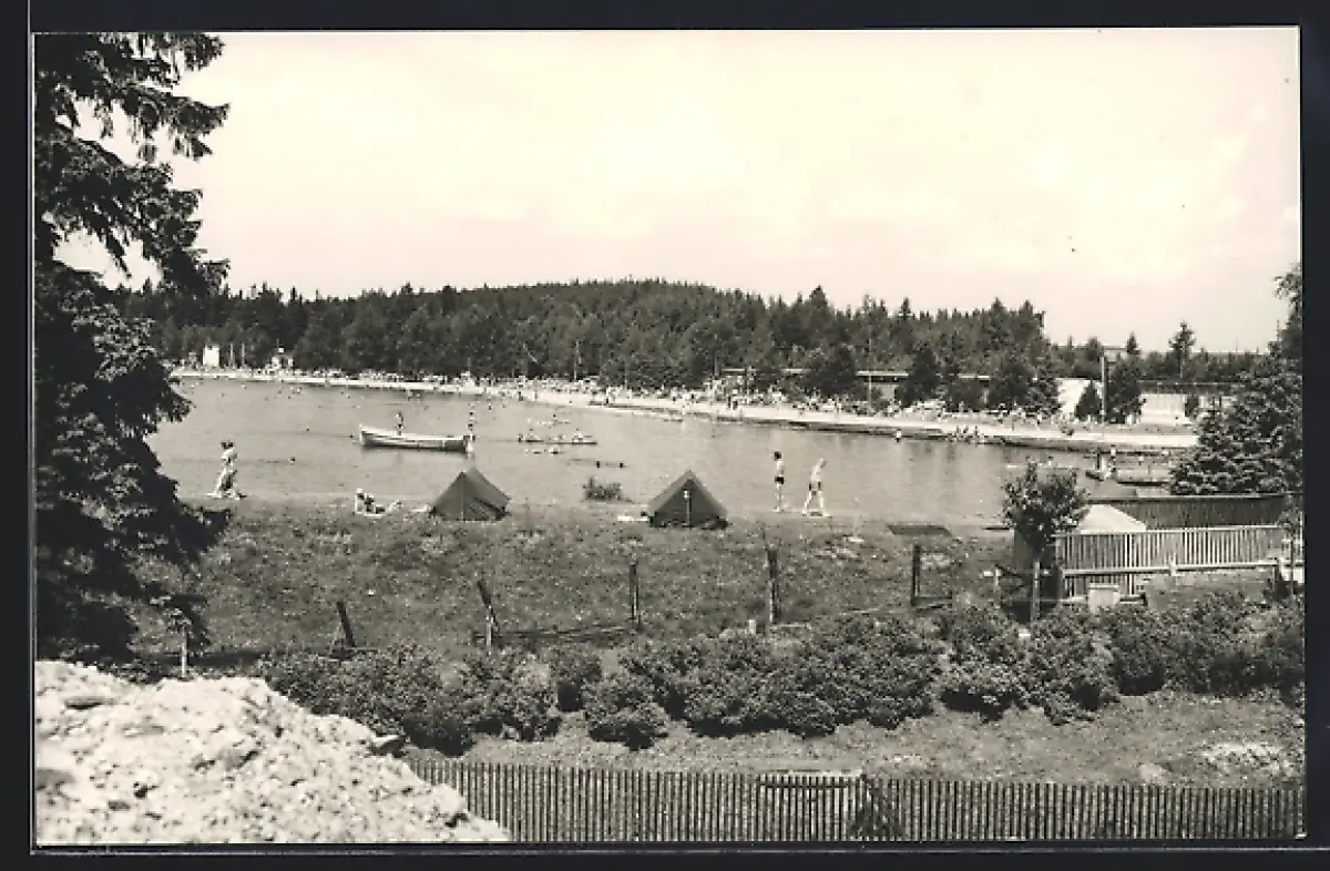 AK Schneeberg i. Erzgeb., Blick auf das Strandbad Filzteich mit Gästen und Zelten
