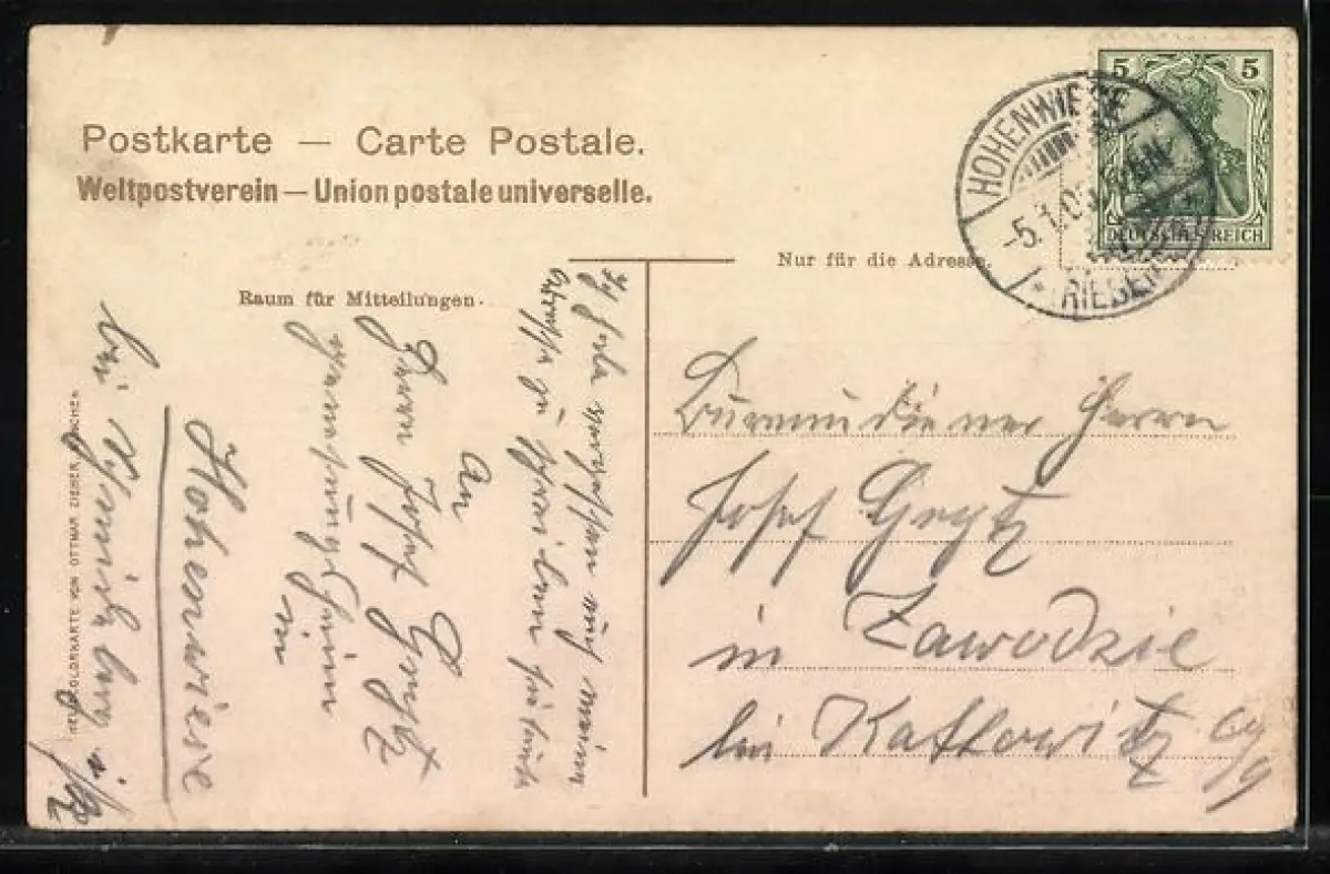 Personenbezogene Daten auf der Rückseite der Karte wurden durch blauen Textmarker unkenntlich gemacht. Die blauen Stellen sind auf die Vorderseite durchgeweicht und wirken sich negativ auf das Postkartenfoto aus