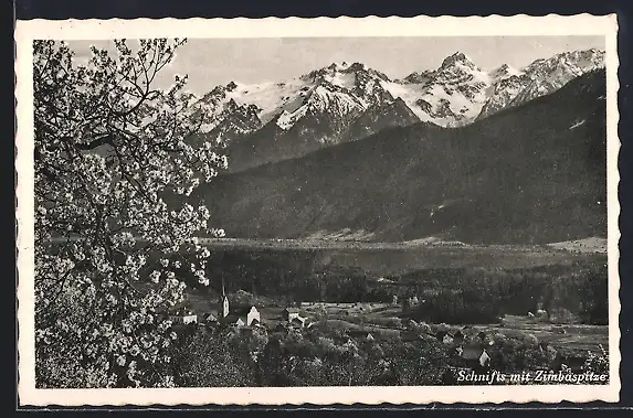 AK Schnifis, Ortsansicht im Frühling mit Zimbaspitze