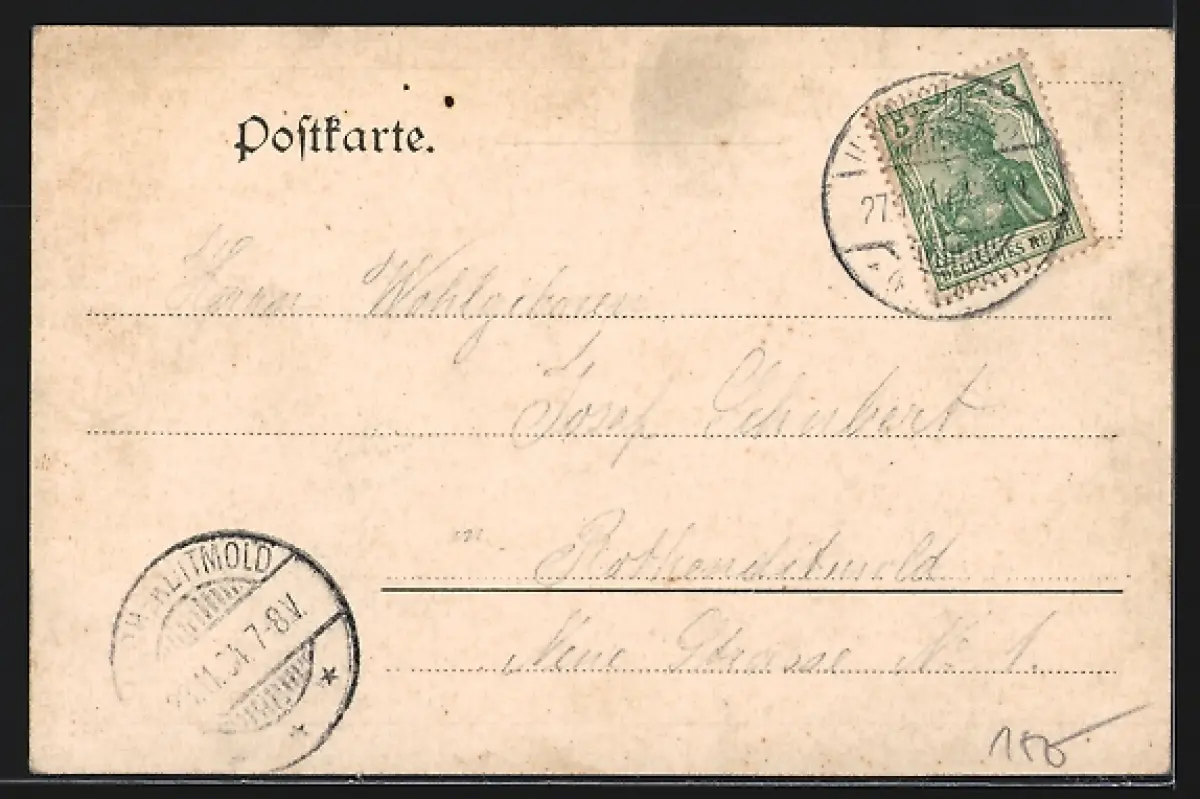 alte Ansichtskarte, gelaufen 1904, Abriebspuren li.