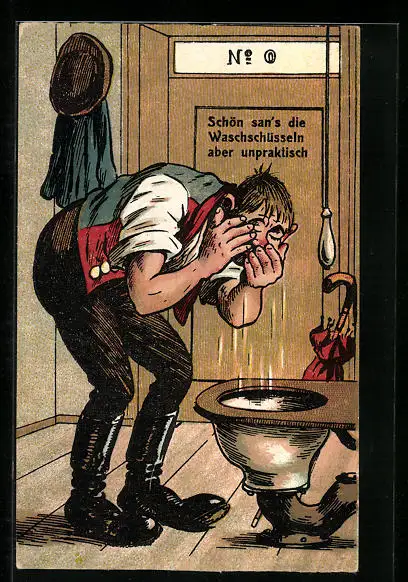 AK Schön san's die Waschschüsseln aber unpraktisch, Mann wäscht sich an einer Toilettenschüssel das Gesicht