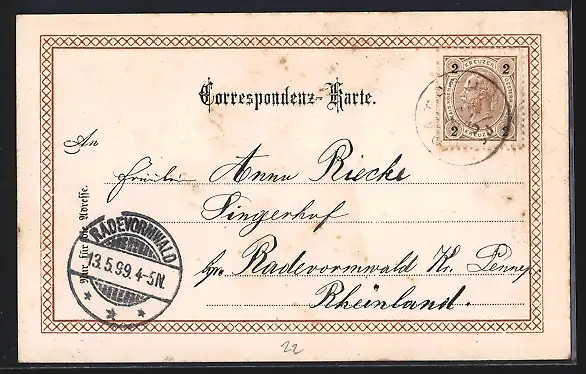 alte Ansichtskarte, gelaufen 1899, Bugspur li., guter Zustand