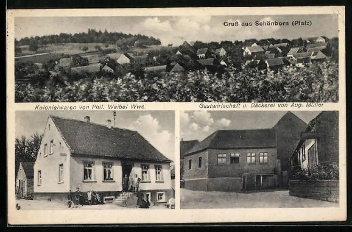 AK Schönborn / Pfalz, GasthausAugust Müller, Kolonialwarengeschäft Phil. Weibel Wwe.