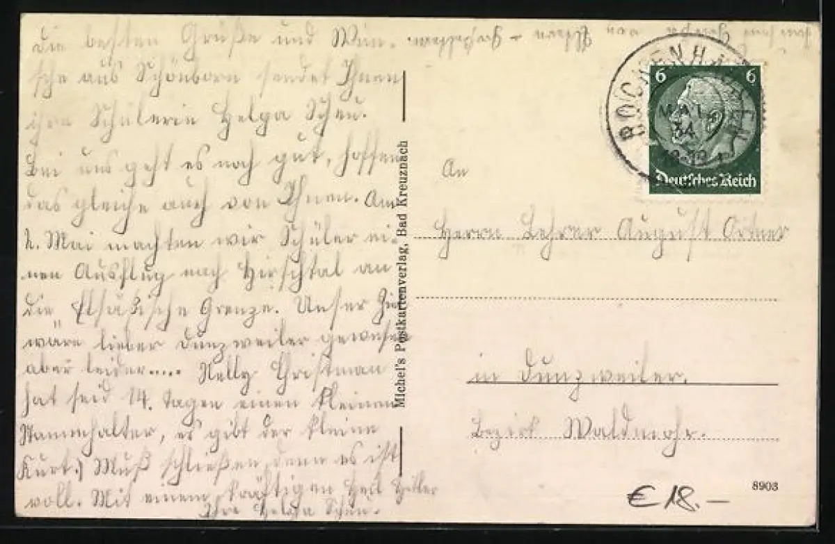 gelaufen 1934, Eckknick rechts oben, guter Zustand