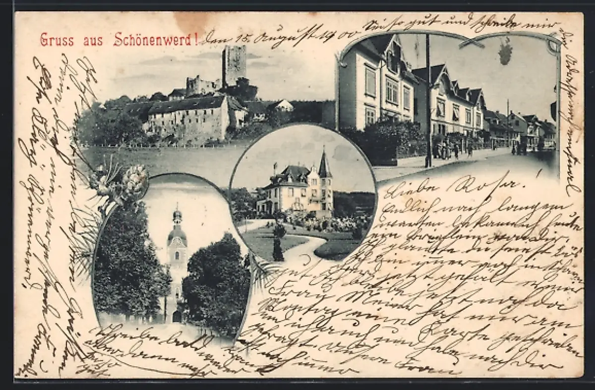 AK Schönenwerd, Strassenpartie mit Wohnhäusern, Ruine Falkenstein, Blick auf die Kirche