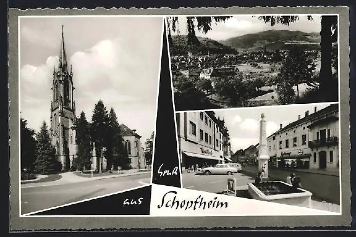 AK Schopfheim, Kirche, Ortsansicht, Brunnen