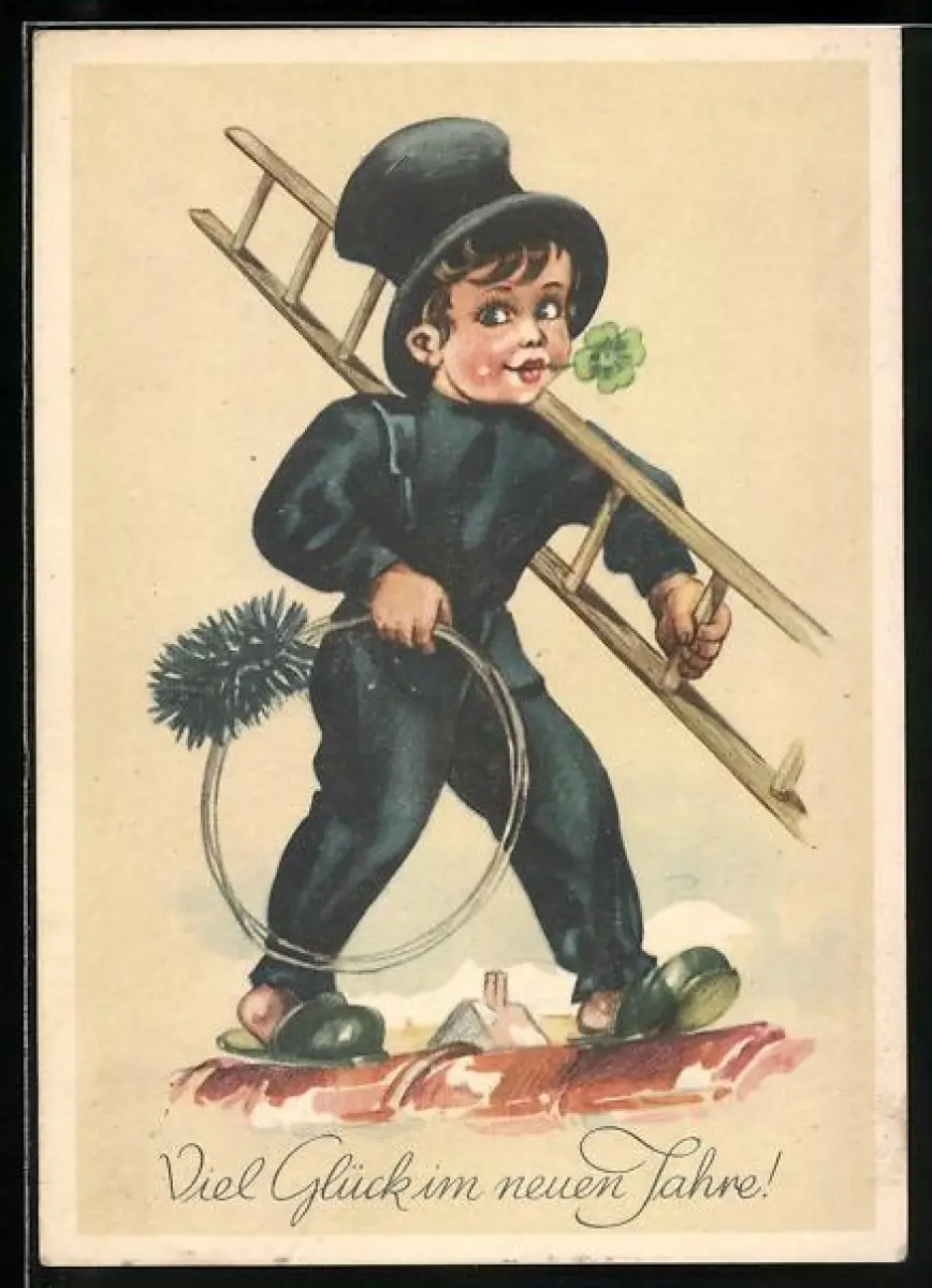 AK Schornsteinfeger auf dem Dachsims mit Leiter und Kleeblatt