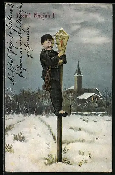 AK Schornsteinfeger auf einer Laterne im Schnee, Prosit Neujahr