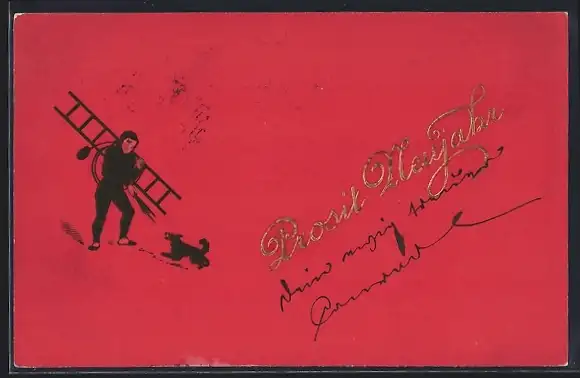 AK Schornsteinfeger auf rotem Hintergrund, Prosit Neujahr
