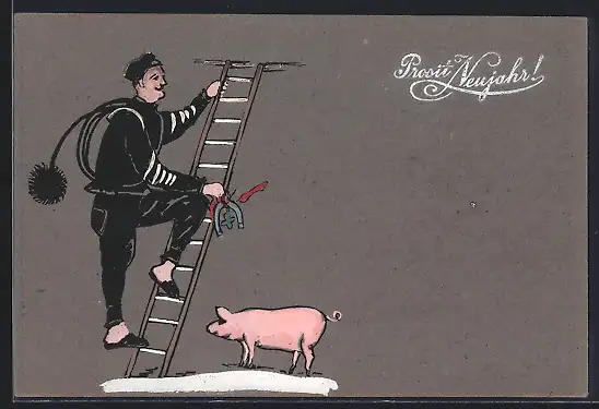 AK Schornsteinfeger klettert eine Leiter empor, Prosit Neujahr
