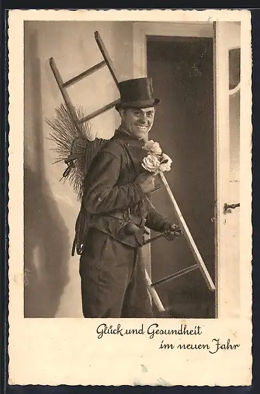 AK Schornsteinfeger mit Leiter und Rosen, Neujahrsgruss